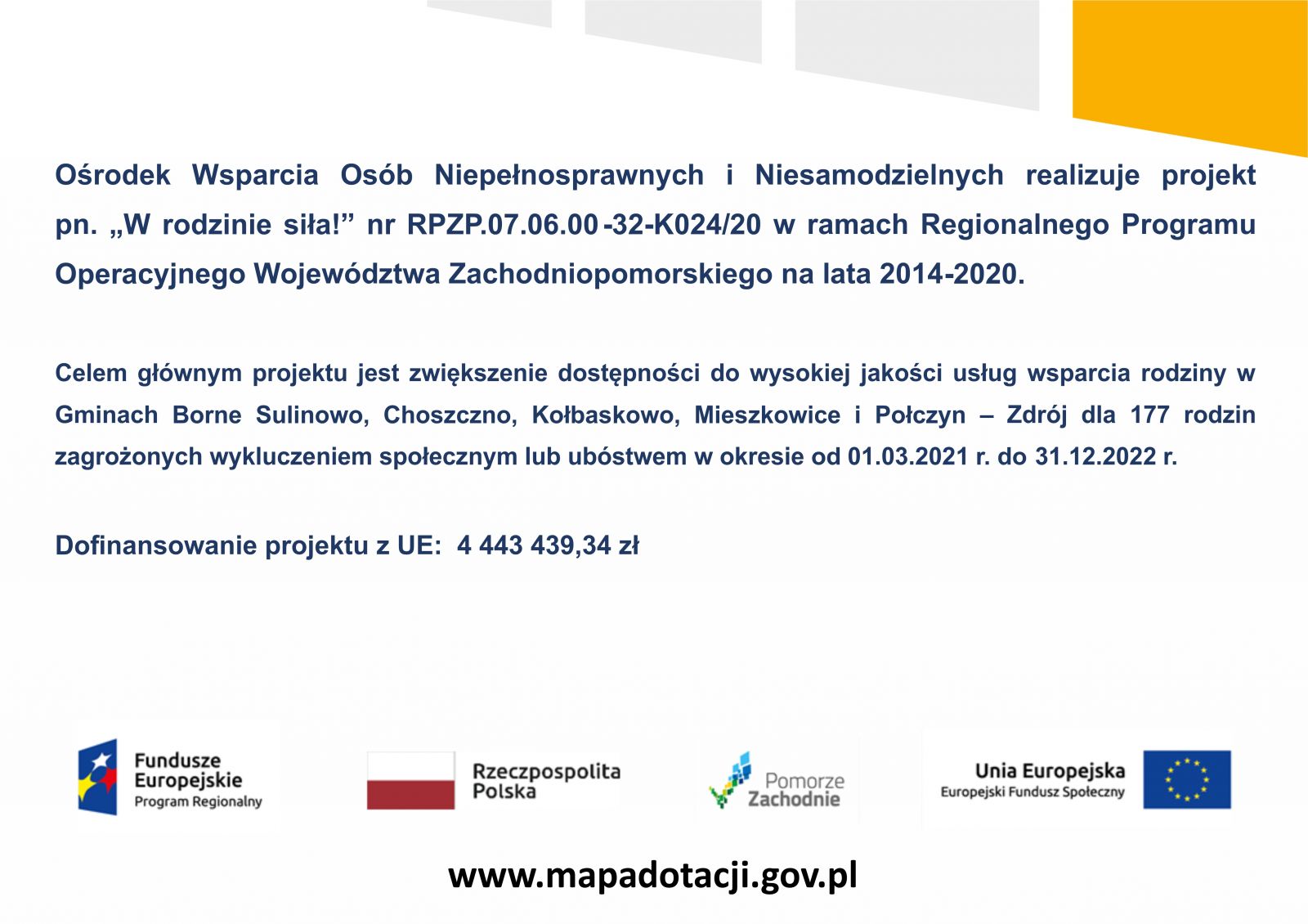 Celem głównym projektu jest zwiększenie dostępności do wysokiej jakości usług wsparcia rodziny w Gminach Borne Sulinowo, Choszczno, Kołbaskowo, Mieszkowice i Połczyn dla 177 rodzin zagrożonych wykluczeniem społecznym lub ubóstwem w okresie 01.03.2021- 31.12.2022. Projekt będzie skierowany do osób zagrożonych ubóstwem i/lub wykluczeniem społecznym (218 rodziców i 271 dzieci w 177 rodzinach w zakresie systemu wspierania rodziny) oraz 20 osób - kadry wsparcia rodziny (jako otoczenia osób zagrożonych wykluczeniem społecznym).