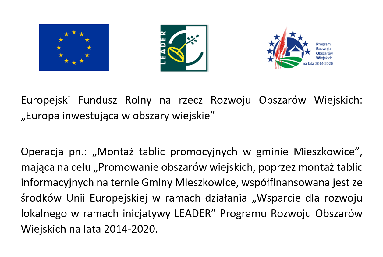W Gminie Mieszkowice zakończono realizację operacji pn.: „Montaż tablic promocyjnych w gminie Mieszkowice”. Zakres projektu obejmował montaż tablic na granicach gminy Mieszkowice w kierunku Szczecina, Osinowa, Kostrzyna i Dębna. Wartość projektu wyniosła 61 000 zł, dofinansowanie około 37 000 zł. Operacja realizowana była z Europejskiego Funduszu Rolnego na rzecz Rozwoju Obszarów Wiejskich, współfinansowana ze środków Unii Europejskiej w ramach działania „Wsparcie dla rozwoju lokalnego w ramach inicjatywy LEADER” Programu Rozwoju Obszarów Wiejskich na lata 2014-2020