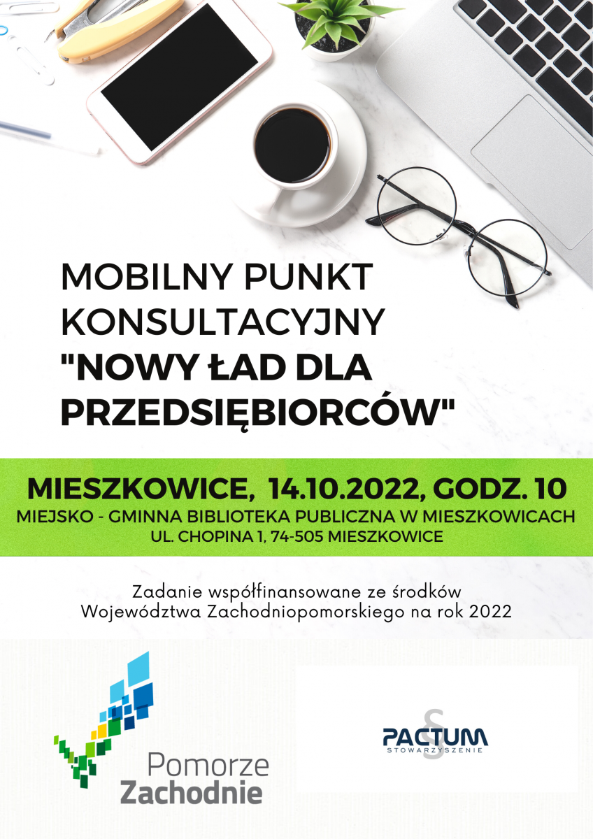 Stowarzyszenie Pactum z siedzibą w Dębnie w 2022 roku realizuje na zlecenie Województwa Zachodniopomorskiego projekt "Mobilny Punkt Konsultacyjny Nowy Ład dla Przedsiębiorców".