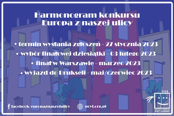 Rok 2022 został przez Komisję Europejską ogłoszony Rokiem Młodzieży, dlatego też już po raz piąty zapraszamy młodzież ze szkół ponadpodstawowych do udziału w konkursie w ramach projektu Europa z naszej ulicy, w którym nagrodą jest wyjazd do Brukseli i spotkanie z europosłami. Organizatorem konkursu jest Polska Fundacja Dzieci i Młodzieży. Nabór projektów trwa do 27 stycznia 2023.