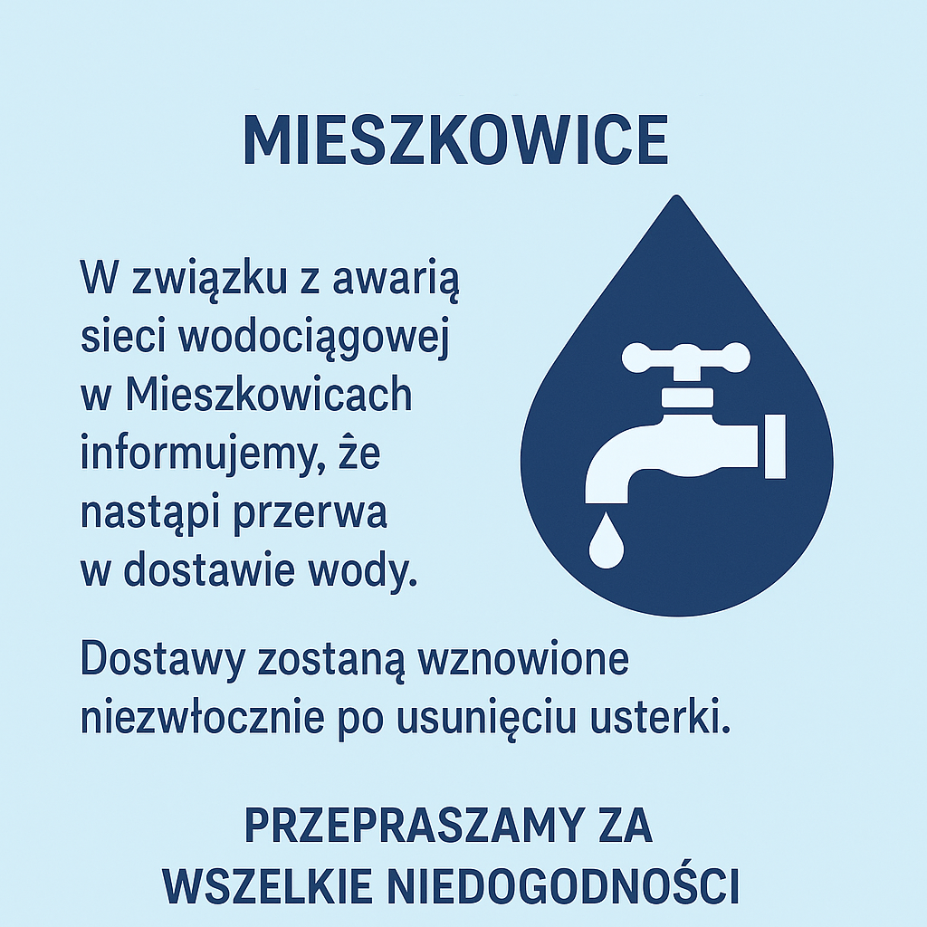 W związku z awarią sieci wodociągowej w Mieszkowicach nastąpi przerwa w dostawie wody, która potrwa do czasu usunięcia usterki. Przepraszamy za wszelkie niedogodności.