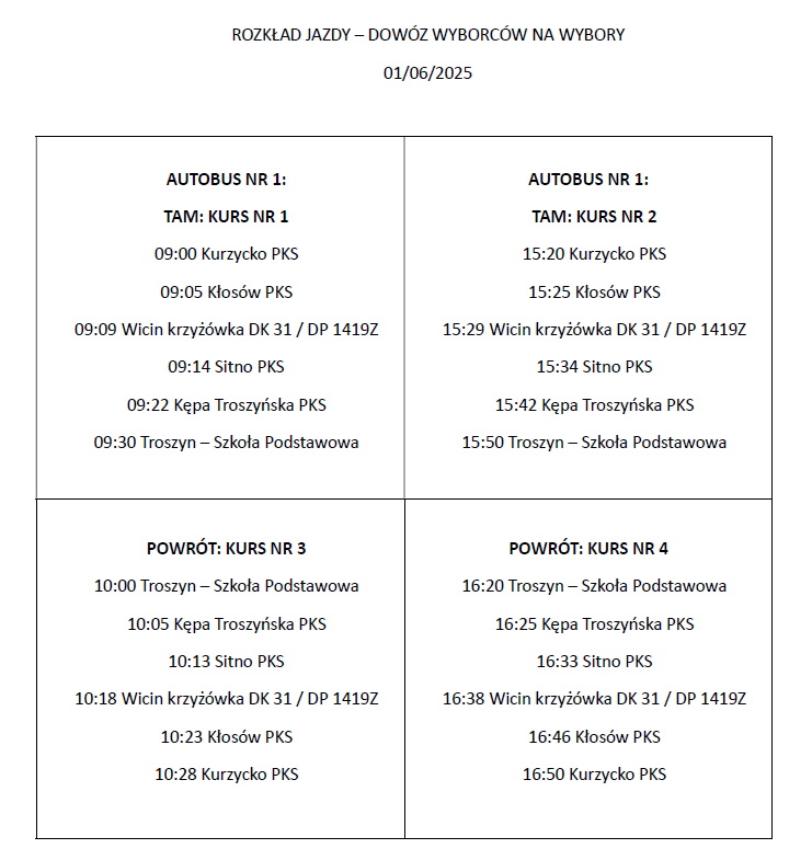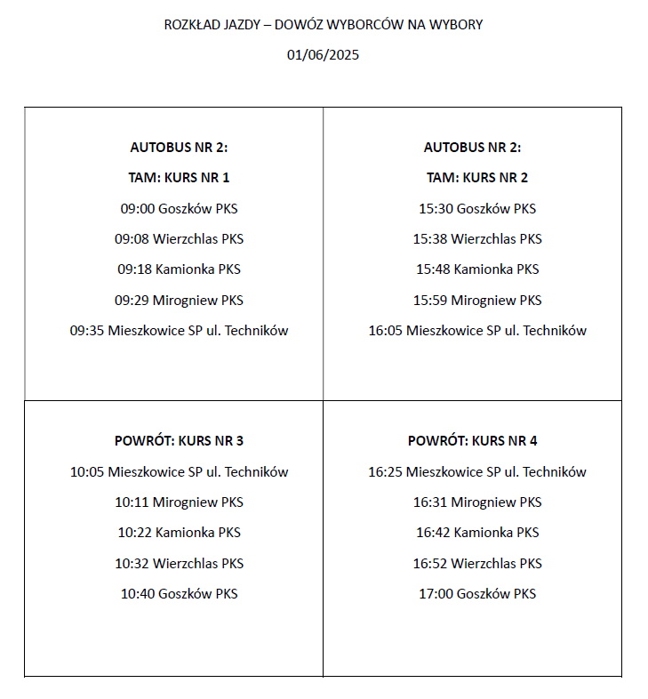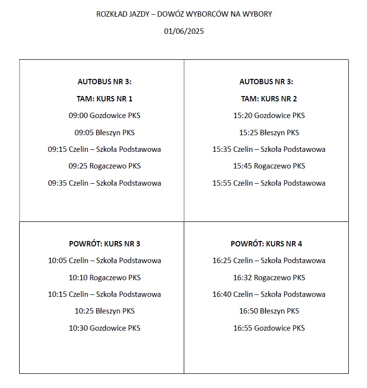 ROZKŁAD JAZDY – DOWÓZ WYBORCÓW NA WYBORY 01.06.2025 r.