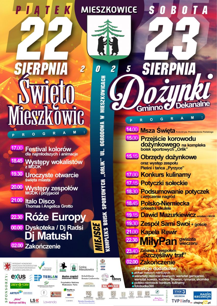 Zapraszamy serdecznie na Święto Mieszkowic (22 sierpnia) oraz Dożynki Gminno-Dekanalne (23 sierpnia)! Będzie to weekend pełen muzyki, smakołyków i świetnej atmosfery dla każdego.