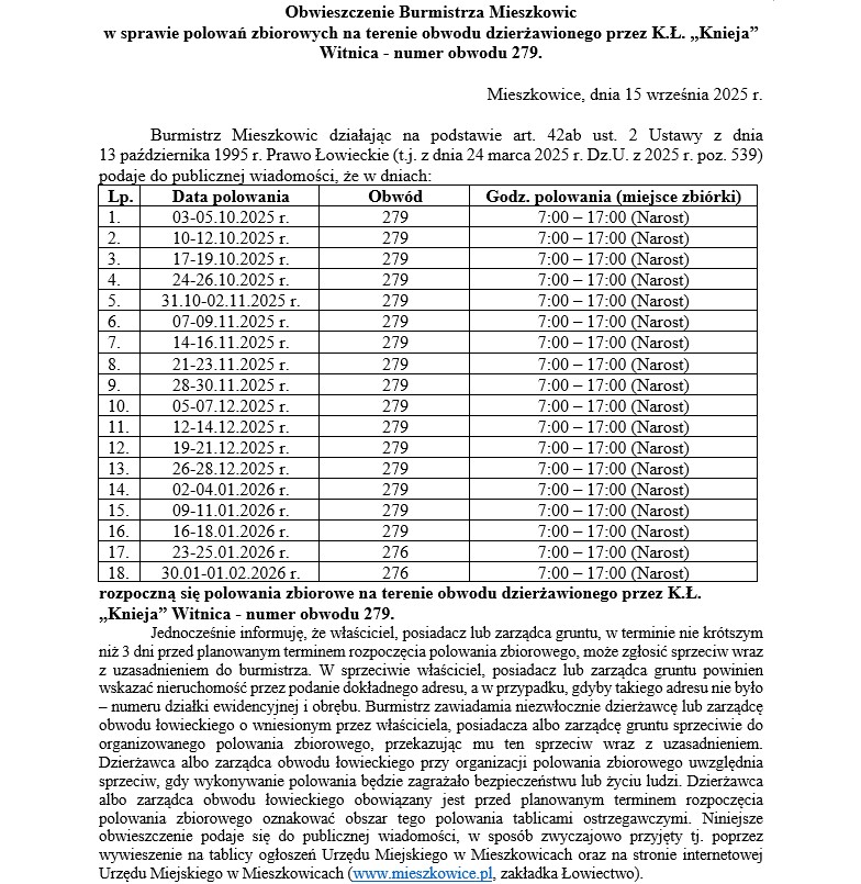 Obwieszczenie Burmistrza Mieszkowic w sprawie polowań zbiorowych