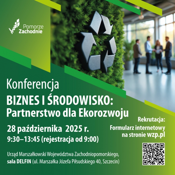 Urząd Marszałkowski Województwa Zachodniopomorskiego – Wydział Ochrony Środowiska wraz z Gabinetem Marszałka, Biuro ds. Sieci Punktów Informacyjnych – serdecznie zaprasza na konferencję "BIZNES I ŚRODOWISKO: Partnerstwo dla Ekorozwoju", której celem jest zbudowanie mostu między światem biznesu a regulacjami środowiskowymi. Naszym zamiarem jest przybliżenie przedsiębiorcom ich ustawowych obowiązków w przystępny i zrozumiały sposób, pokazując, że Urząd to partner wspierający rozwój ekologicznych inicjatyw.