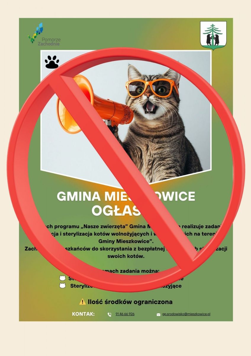 Informujemy, że w związku z wyczerpaniem środków finansowych przeznaczonych na realizację zadania „Kastracja i sterylizacja kotów wolno żyjących i właścicielskich na terenie Gminy Mieszkowice”, dofinansowanego z Urzędu Marszałkowskiego Województwa Zachodniopomorskiego w ramach programu „Nasze zwierzęta”, Gmina Mieszkowice wstrzymuje przyjmowanie zgłoszeń dotyczących sterylizacji i kastracji kotów.