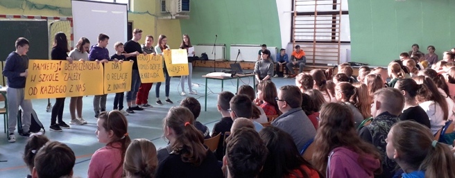 Rozpoczęliśmy go od prezentacji dotyczącej agresji przemocy, zachowań prowokacyjnych oraz cyberprzemocy. Poznaliśmy również różne sposoby bronienia się przed agresją i przemocą. Następnie, dzięki scenkom przedstawionym przez naszych uczniów, dowiedzieliśmy się, co czuje osoba, której bezpieczeństwo jest zagrożone. Na koniec wysłuchaliśmy wystąpienia dzielnicowego z Posterunku Policji w Mieszkowicach młodszego aspiranta Pana Mateusza Bieńka, który omówił odpowiedzialność prawną dzieci i młodzieży.