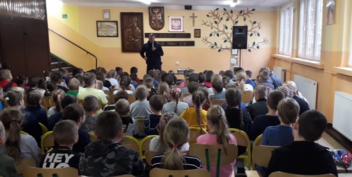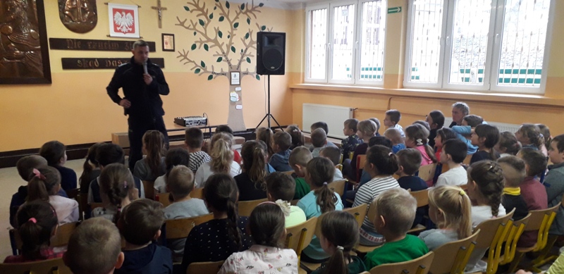 20 listopada br. w naszej szkole odbyło się spotkanie na temat bezpieczeństwa, adresowane do uczniów oddziałów I-III. O tym, jak się bezpiecznie zachować np. w drodze do i ze szkoły, jak bezpiecznie korzystać z Internetu oraz jak postępować podczas nagabywania przez obce osoby, najmłodszym uczniom naszej szkoły opowiadał dzielnicowy z Posterunku Policji w Mieszkowicach młodszy aspirant Pan Mateusz Bieniek. Przedstawił im również zasady bezpiecznego zachowania się, gdy podczas nieobecności rodziców w domu ktoś obcy zapuka do drzwi. Następnie odpowiadał na liczne pytania uczestników spotkania.