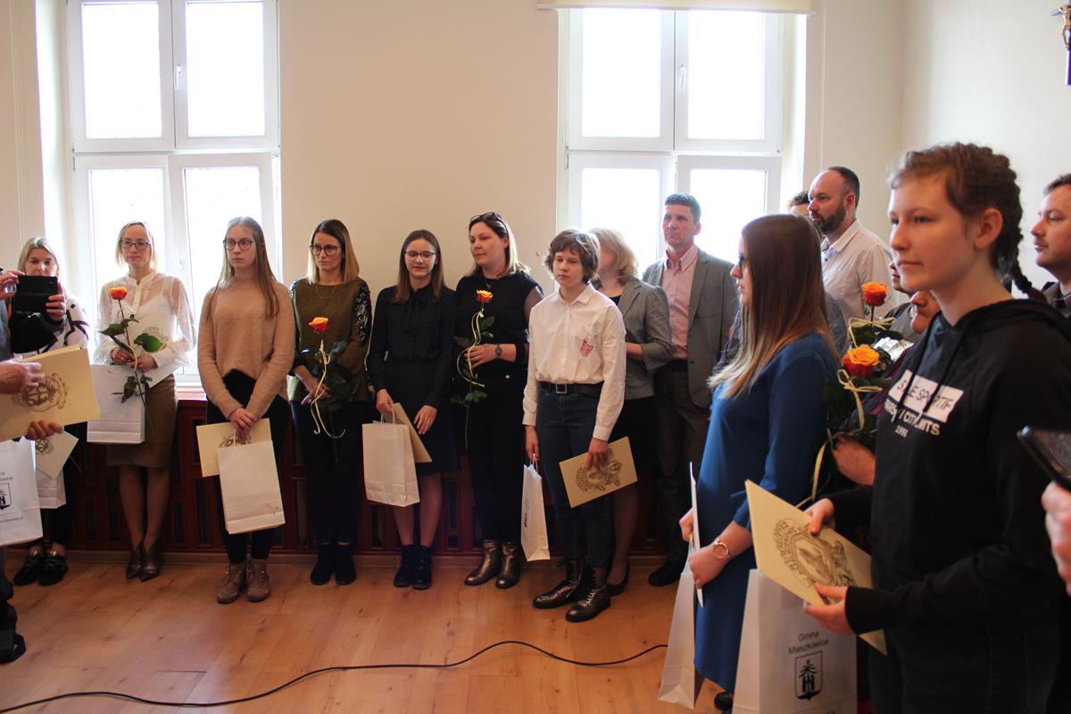 Drobne upominki dla stypendystów wręczyli: burmistrz Pan Andrzej Salwa, przewodniczący rady Pan Zbigniew Kmiecik, wiceprzewodnicząca rady Pani Bożena Nowak oraz radna Pani Bożena Dorywalska.